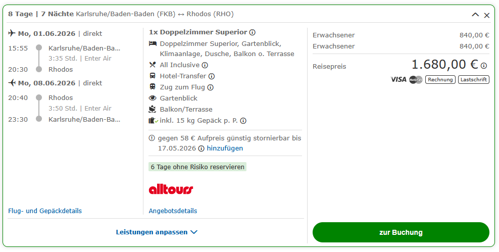 | Abflughafen | ✈️ Karlsruhe (FKB) Hannover (HAJ) Nürnberg (NUE) München (MUC) Düsseldorf (DUS) Weitere gegen Aufpreis |